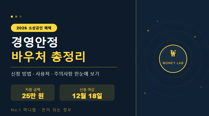 창업지원2026 소상공인 경영안정 바우처 신청 방법 총정리 | 25만원 지금 바로 받으세요 No.1 머니랩 / 4월 29, 2026 2026년 소상공인 경영안정 바우처 신청 방법을 찾고 계신가요? 매달 나가는 전기요금, 가스비, 4대 보험료… 고정비는 그대로인데 매출은 줄어 숨이 막히는 […]